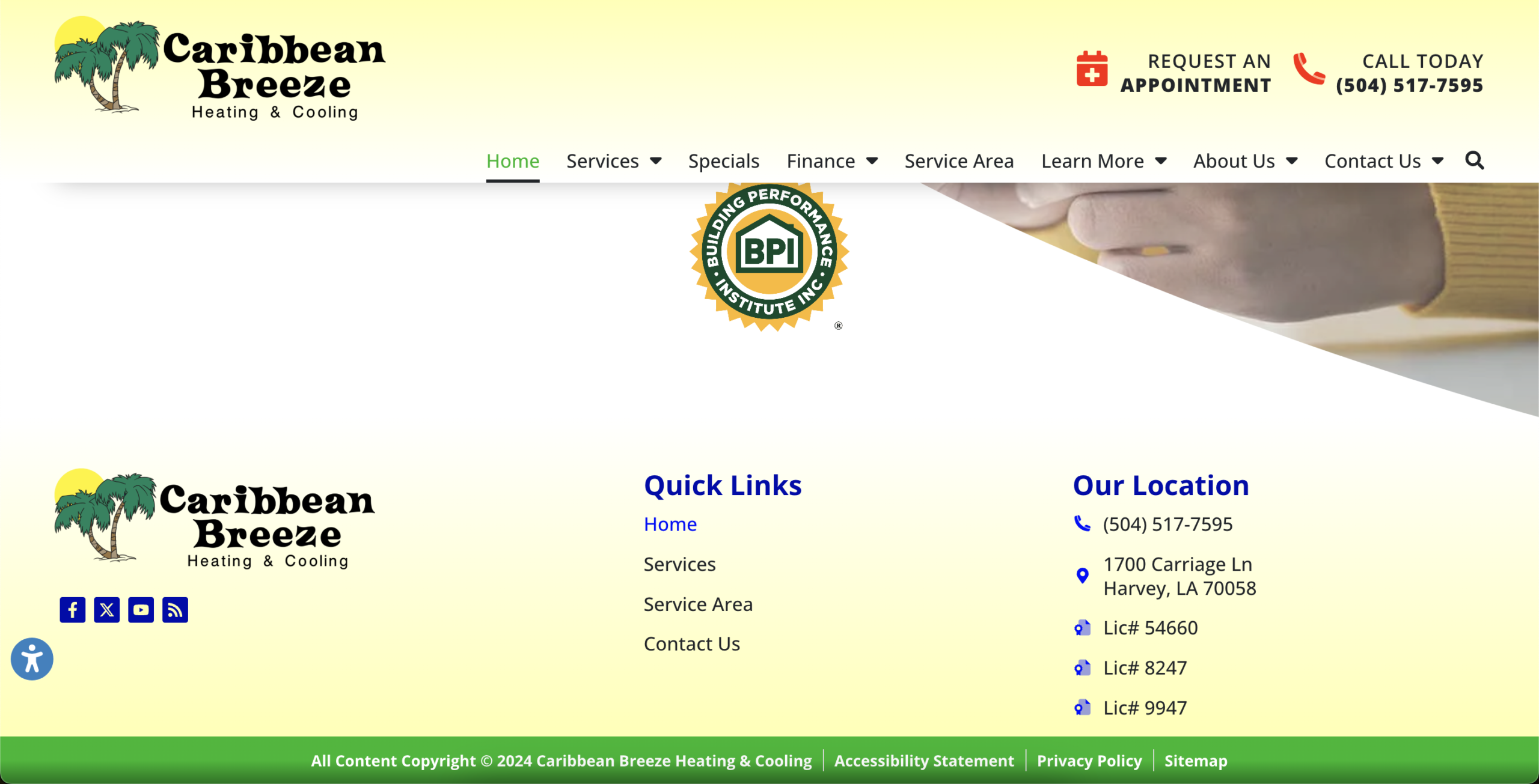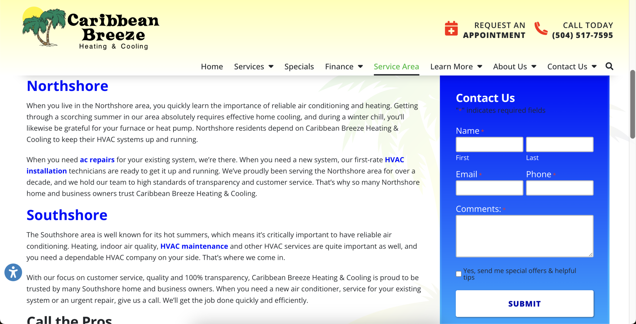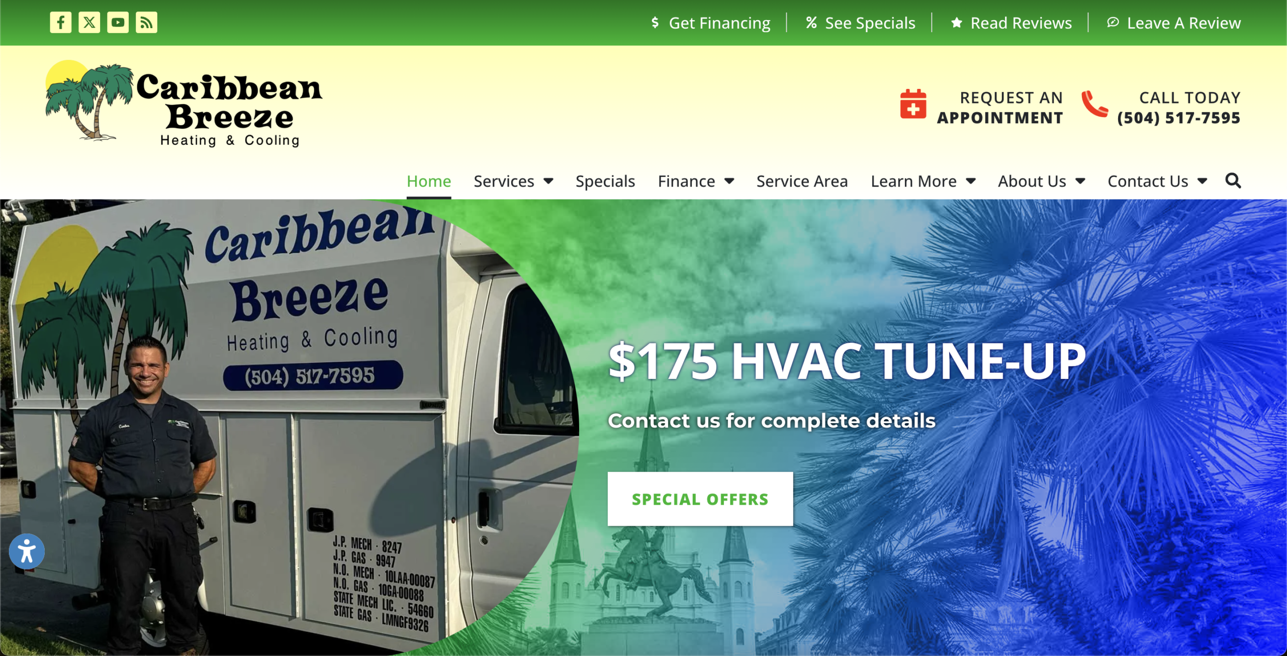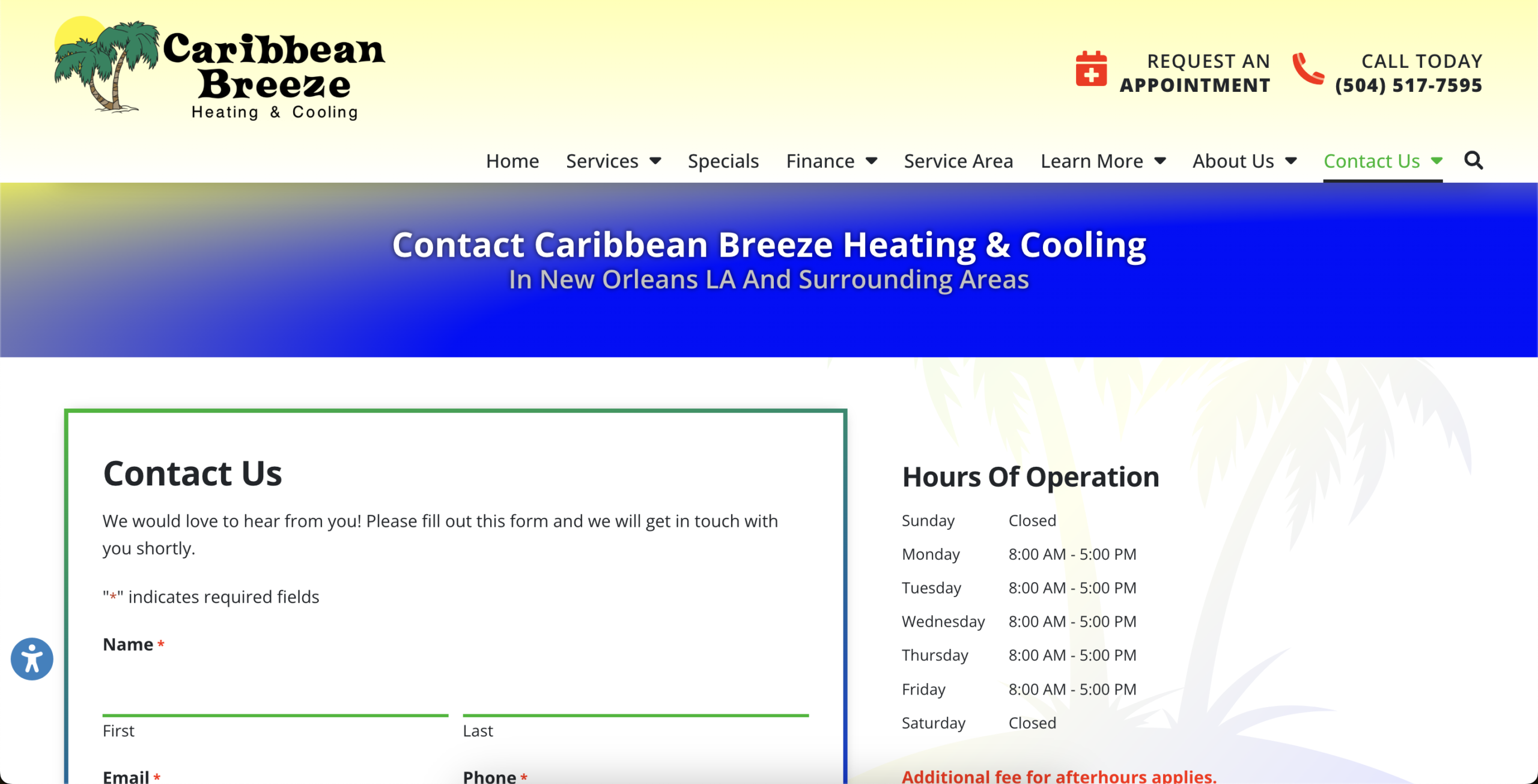 I combined the beach theme with the palm trees from their logo and integrated New Orleans imagery throughout the site. Additionally, I utilized a parallax background featuring their palm trees to enhance the design and provide a dynamic visual experience.